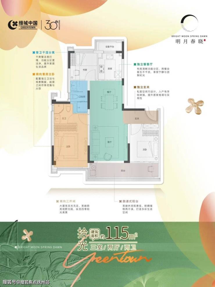 建面约115㎡三房户型:独立玄关、独立餐客厅、南向三开间、双开间阳台、南向套房主卧、客卫干湿分离,一个人的自在天地、夫妻的甜蜜世界,都可以轻松兼容。