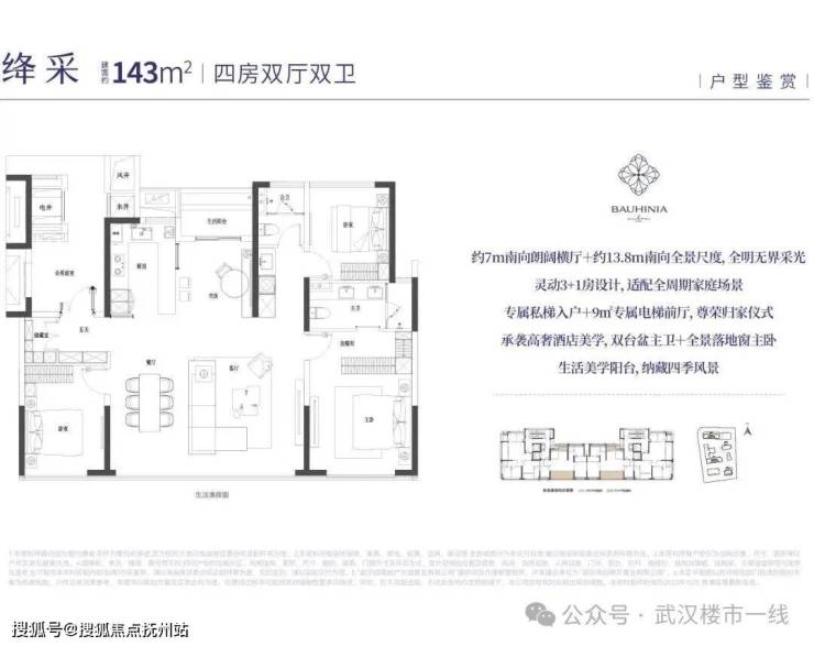 招商紫荆府包含4栋31-32层高层住宅,预计首开1号楼建面约143平房源。