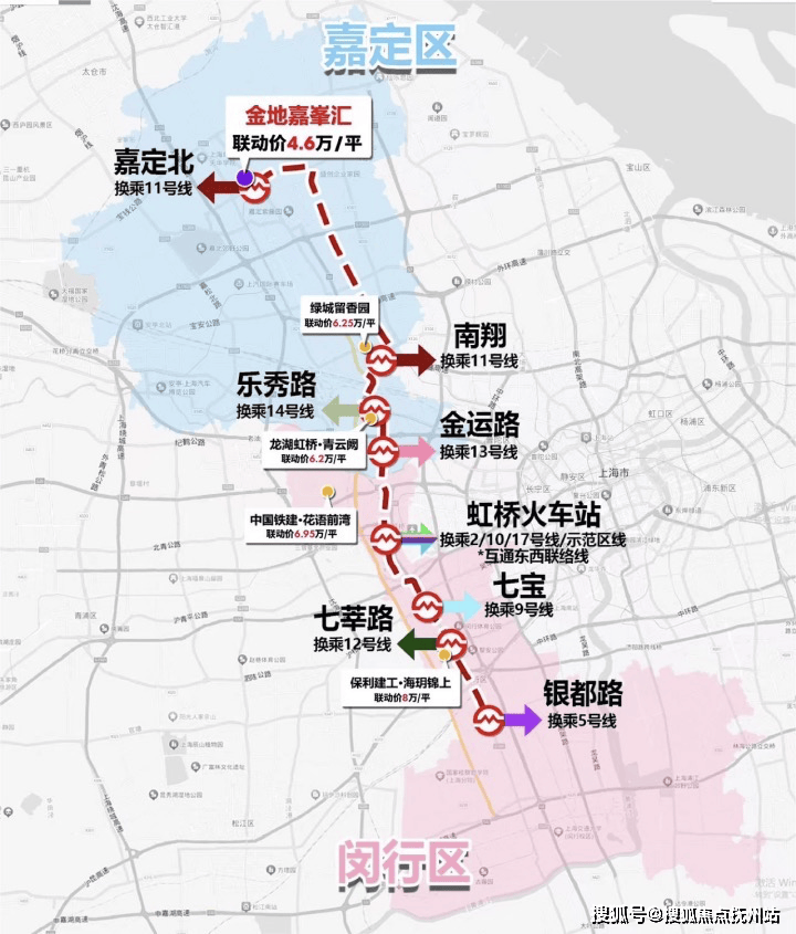 直线距离约200米嘉闵线(在建),8站直达大虹桥,连接七宝、莘庄等多个CBD,不论是上下班、聚会、商务出差等都十分便捷。另外值得一提的是沿线新盘均价均在6-8万区间,其中约350万总价的潜力盘或许只有金地嘉峯汇!