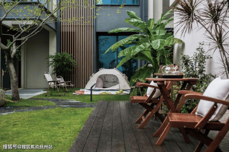 门前柔软的草坪宛如一块天然的绿色地毯,结合自然的汀步以及野趣的户外帐篷——家门口,是离日月星辰最近的地方,一家人在此尽享无尽天伦之乐。