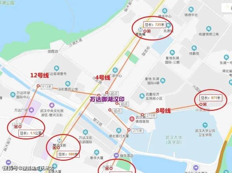 地铁方面:周边有三条地铁,到4号线楚河汉街站约580米,青鱼嘴站约725米;到8号线中南医院站约871米,水果湖站约701米;12号线在建中,距离公正路站约1.1公里。