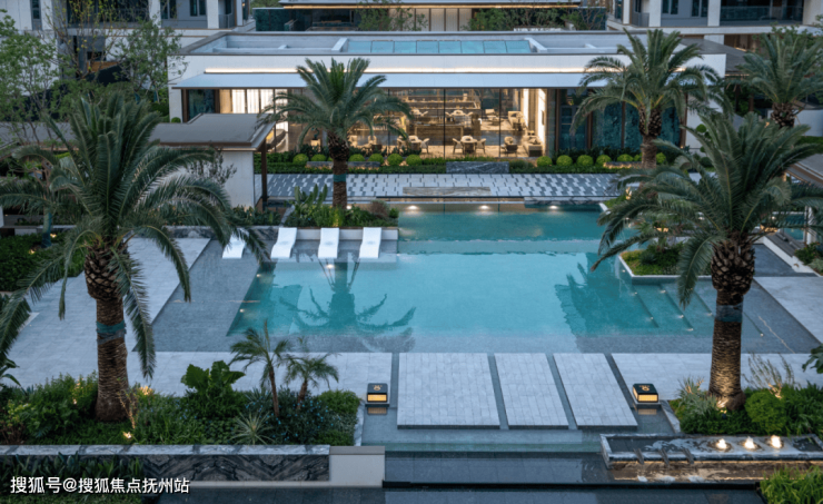 外立面与公区:采用 三面铝板+270°曲面玻璃(供应商为深圳南玻),顶部弧形塔冠设计,成本较常规住宅高约30%。示范区铺装 普拉达绿奢石超4000㎡,入口黑山石单块重26吨,泳池旁配6棵 加拿利海枣树(单棵价值8万+)。
