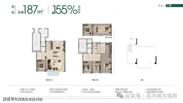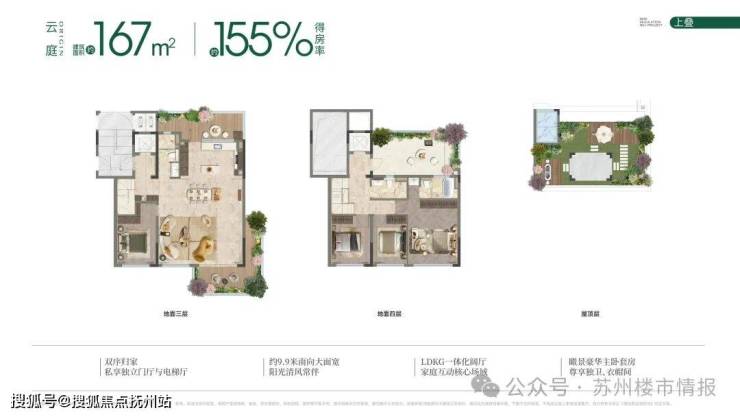 上叠建面约168㎡户型,综合使用率约155%,最大亮点是5花园设计——3层配备南北双露台,4层有朝北大露台,同时包含屋面空间,拓展了户外使用场景。