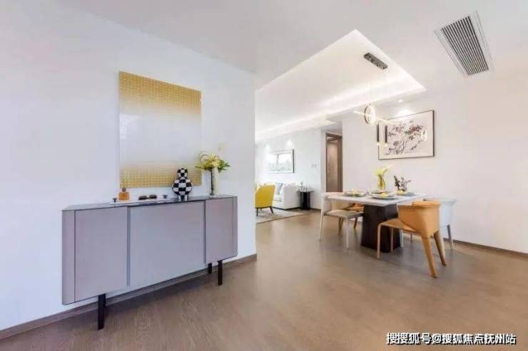餐客厅一体化空间设计,加上南向观景阳台,形成一个约35㎡整体的家庭互动功能空间,方便一家人在区域内交流、互动。