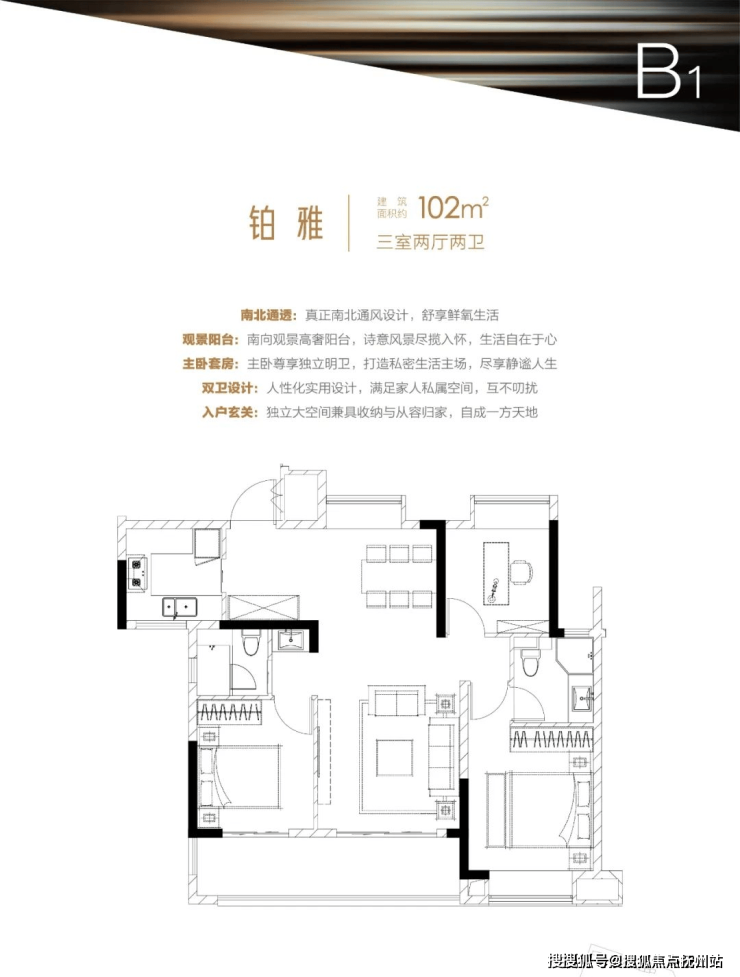 同样,我们再来看看 102㎡的宝藏三房,也是亮点满满,诚意十足。