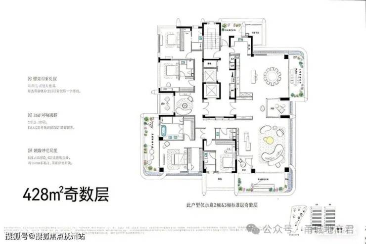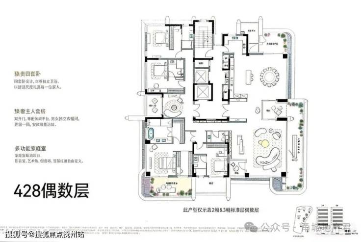 项目由7幢四代宅高层(15-16F)组成,定位纯高改,户型面积185/255/300/428平。其中428平为一层一户产品。由于是四代宅,奇偶层在阳台上有区别。