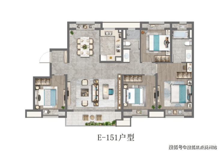 建筑面积约104㎡的3房户型,四开间朝南+主卧套房设计+全卧室带飘窗+南北通透+超大的宽面阳台,做出了拥有120㎡以上户型的尺度感和舒适度。如果预算合适,这个户型特别推荐。