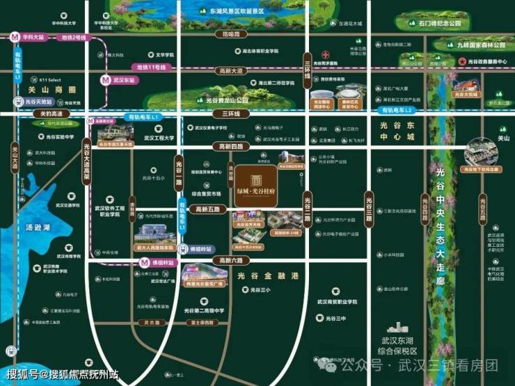 三横三纵,纵向串联光谷金融港、软件园和光谷老城区;横向连接武昌、汉口等核芯地区及光谷东。项目临地铁2号线佛祖岭站和L1有轨电车高新五路站,可通达全城,交通便利。
