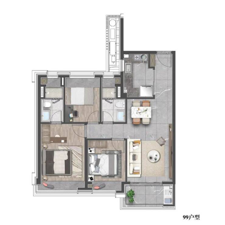 建面约 99㎡3房2厅2卫,全明户型设计+LDKG一体化设计,尺度非常宽敞
