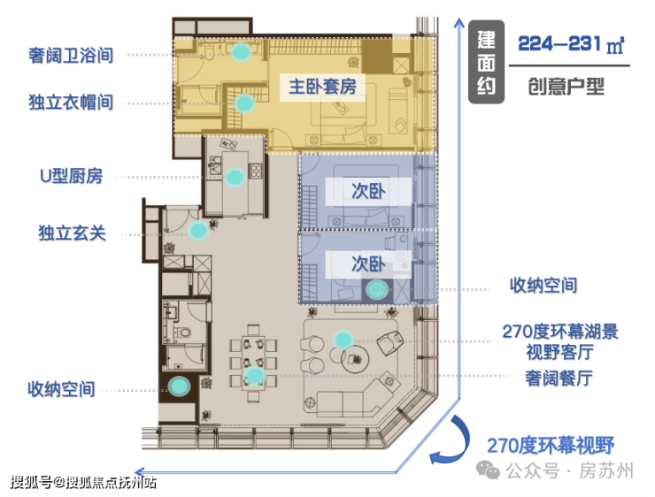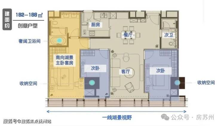 这个户型实现了270°环幕湖景+南向面宽豪宅尺度,是为需要兼顾功能性与社交性改善家庭定制的高段位解法。