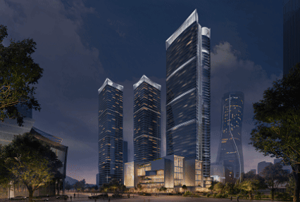 杭州绿发中心总建筑面积约43万㎡,由4幢塔楼构成,集总部甲级写字楼、江景藏品、旗舰商业等多元业态于一体。其中超甲级写字楼建筑面积约11万㎡,共57层,从江对岸望过去,钱江新城CBD地标群矗立北岸,建筑高度约249米的杭州绿发中心站稳“C位”,刚好处于一线江景地标建筑群的制高点,封面地标的气势渐显。