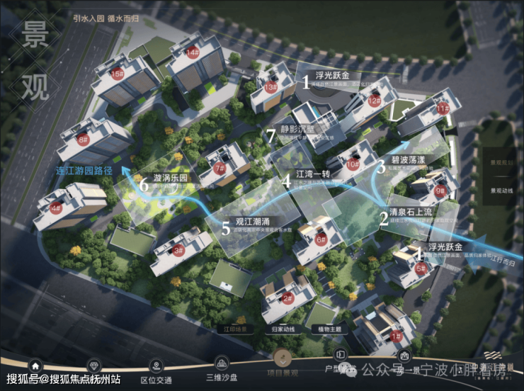 中海·江湾樾依托约4.1万方宽绰景观面,规划3大中庭景观空间。以江、水为介的景观叙事展开与人居的自然交流,引江入园、循水而归,设置「一轴/三园/五境/N花园」景观体验,打造全维度、多功能、沉浸式的江岸生活场景。