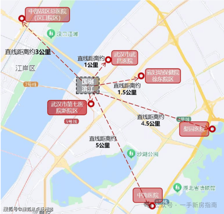 项目5-10分钟车程内拥有包含中南医院、梨园医院、中部战区总医院、湖北省妇幼保健院、武昌医院等多个三甲医院,项目南边不远就是在建的七医院新院区,目前已经封顶,建成后业主看病就医也比较方便。