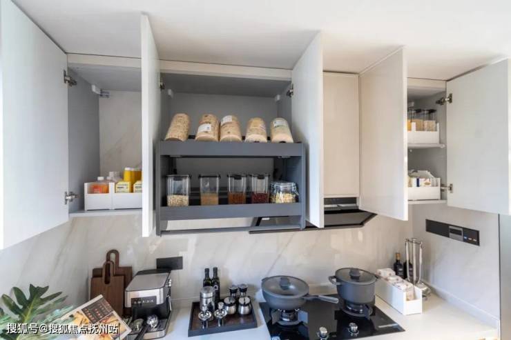 厨柜采用考究的烤漆面板,橱柜内配置了4种拉篮——抽屉式碗碟拉篮、窄边拉篮、天使拉篮、斜抽拉篮(统称魔术拉篮),锅碗瓢盆等皆可纳入其中,高效利用空间。