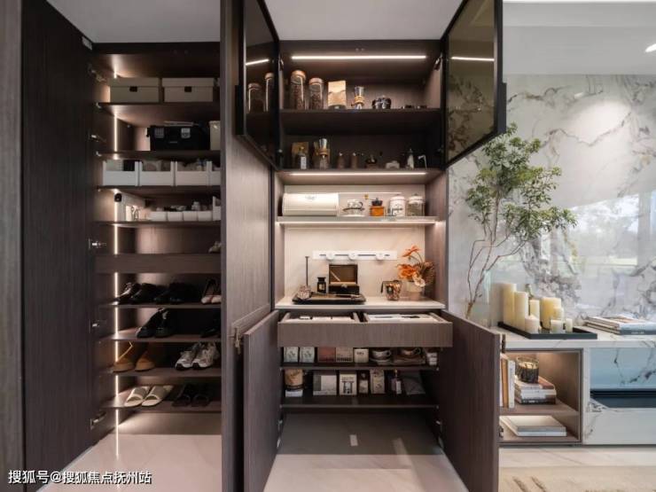 不同于普通柜,望云润玺独家定制玄关+餐边柜一体化魔方柜,一家人的鞋子都能妥贴安置。
