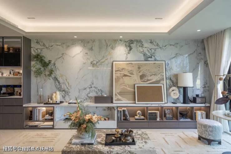 LDKG一体化设计,搭配大面落地玻璃,地面白金沙岩板通铺,吊顶是大通顶,双背景墙采用壁布硬包、帝王翡翠岩板,没有多余的结构墙体,以豪奢尺度构建出家庭交流的超级广域公区。