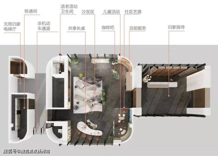 “堂客厅”源自江南一带民居的公共空间——“客堂间”。引入“堂客厅”的空间,呈现社区邻里关系新的可能性;邻里关系的唤起,让人收获温情。社区堂客厅分为接待大堂、欢聚客厅、自助堂客站、共享长桌、小小堂客站、艺展区、快递间、无雨归家电梯厅、无障碍卫生间等九大场景。