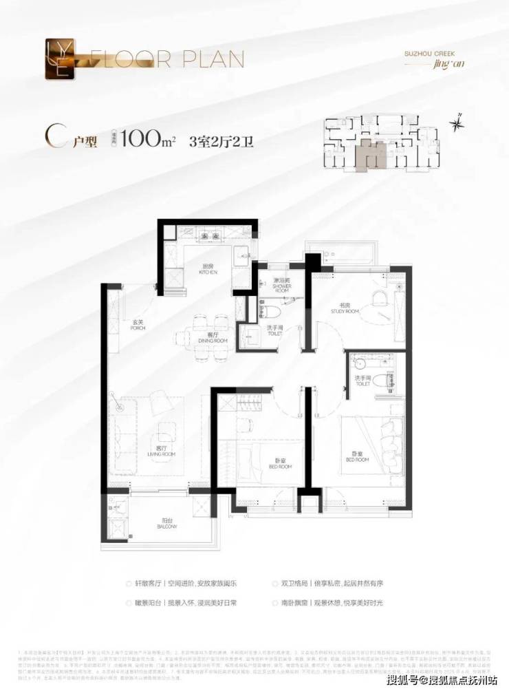 建筑面积约100㎡3房D户型:南北通透的设计让该户型拥有更加优秀的通风效果。而且这个户型做到了全卧飘窗(3个飘窗)+南向瞰景大阳台,丰富的灵动空间提升了实得面积!