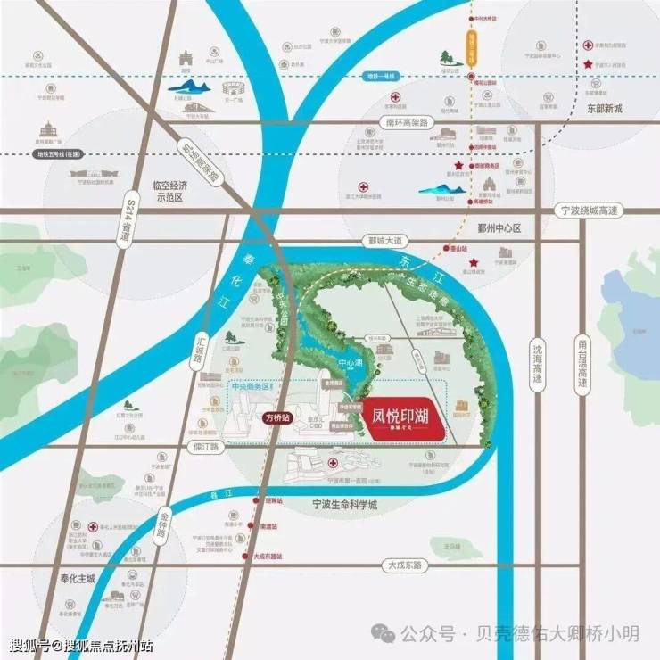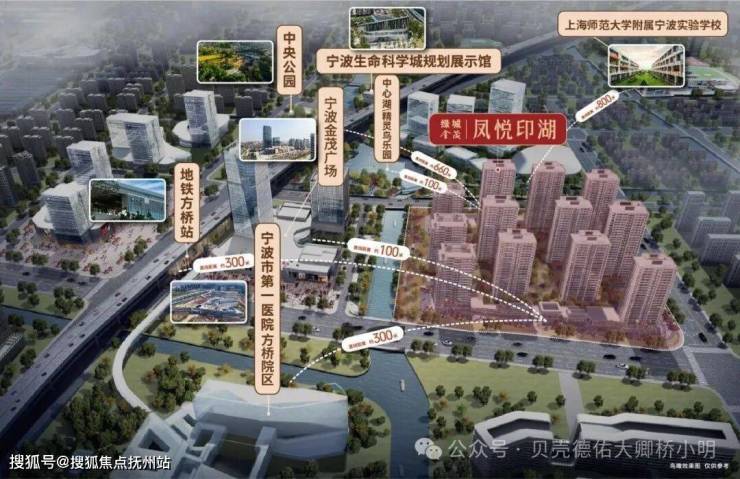 图注:项目以凤悦印湖建筑群为核心,标注宁波市第一医院、地铁方桥站、中央公园、上师大附属宁波实验学校等配套及距离,展现“地铁+湖居+商圈+医疗+教育”五维黄金生活圈。