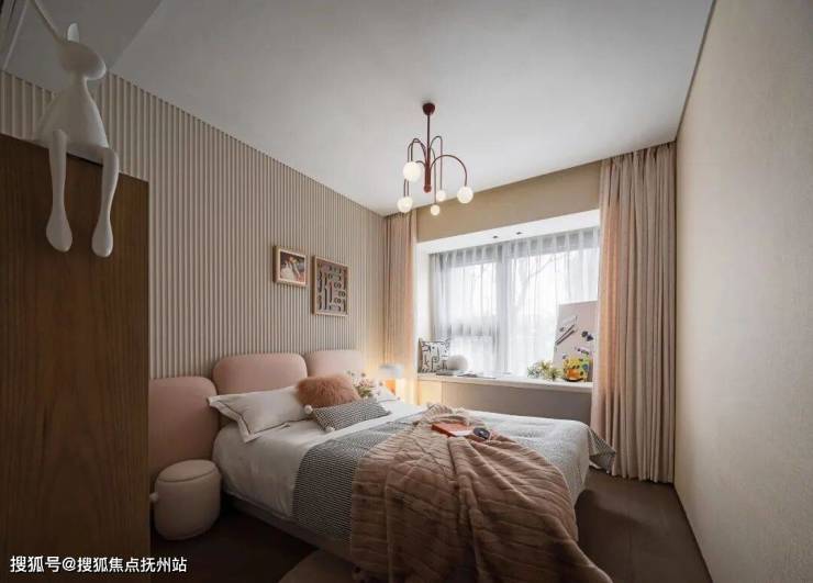 女孩房以米灰色与粉色为主基调,配合橘色和豆沙色的点缀,体现女孩天真娇俏的同时凸显出善良与精致。