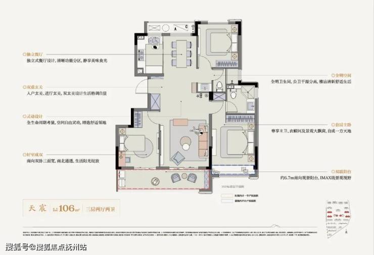 最热销的106方户型:独立式餐厅设计,清晰功能分区,静享美味食光;人户玄关、进厅玄关,双玄关设计生活格调自显;全生命周期考量,空间自由灵动,缔造舒适领地;南向双卧三面宽,南北通透,生活阳光绽放;全明卫生间,公卫干湿分离,雅洁清新舒适生活;尊享主卫、衣帽间及景观大飘窗,自成一方天地;约6.7m南向观景阳台,IMAX级景观视野。