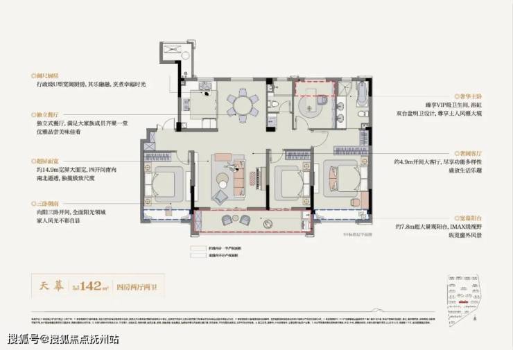 突破极限的142方户型:行政级U型宽阔厨房,其乐融融,烹煮幸福时光;独立式餐厅,满足大家族成员齐聚一堂,优雅品尝美味佳肴;约14.9m宽屏大面宽,四开间南向南北通透,独揽极致尺度;向阳三卧开间,全面阳光领域,家人风光不彰自显;臻享VIP级卫生间,浴缸、双台盆明卫设计,尊享主人风雅大境;约4.9m开间大客厅,尽享功能多样性,盛放生活乐趣;约7.8m超大景观阳台,IMAX级视野,纵览窗外风景。