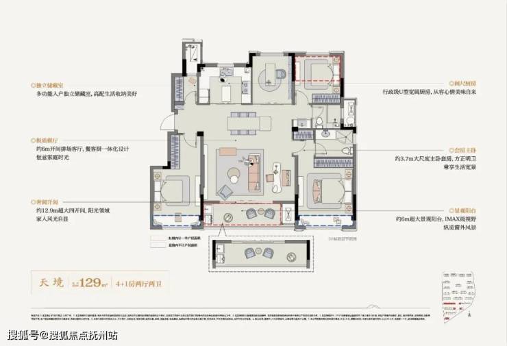 王者级别的129方户型:多功能入户独立储藏室,高配生活收纳美好;约6m开间排场客厅,餐客厨一体化设计,惬意家庭时光;约12.9m超大四开间,阳光领域,家人风光自显;行政级U型宽阔厨房,从容心情美味自来;约3.7m大尺度主卧套房,方正明卫,尊享生活宽景;约6m超大景观阳台,IMAX级视野,纵览窗外风景。