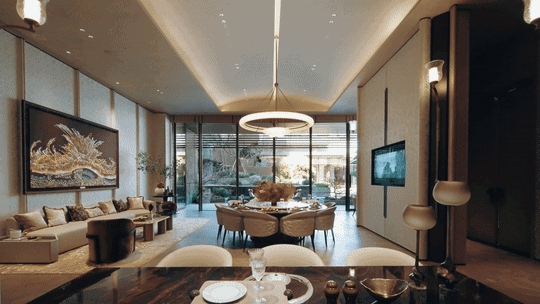 主入口"凤起冕旒"堪称艺术品,6米宽手工串联6045颗景泰蓝珠,搭配库班绿石材、威尼斯棕大理石等老钱风奢石,设计灵感源自周代礼器,转译为迎接精英的"精神冠冕"。8棵珍稀乔木点缀门庭,移步易景,归家仪式感拉满。