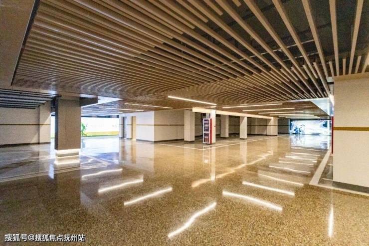 再将目光聚焦到一般项目容易忽视的地库空间。明亮阔绰的地库空间内,顶部以咖色格栅及吊顶光源重塑空间层次感,与之相对应的是在灯光下熠熠生辉的彩石地坪。