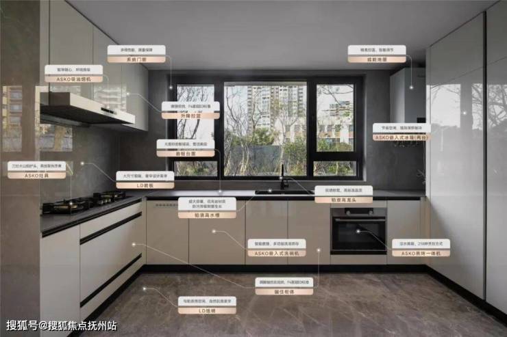 在厨房空间,项目配备了厨电界的“爱马仕”ASKO厨电六件套(油烟机、三眼燃气灶、洗碗机、蒸烤一体机、两台嵌入式冰箱)以及德国高端水槽品牌BLANCO的花岗岩石墨水槽和可抽拉式水龙头等,以卓越品质、技术创新与健康呵护诠释高奢人居新体验。