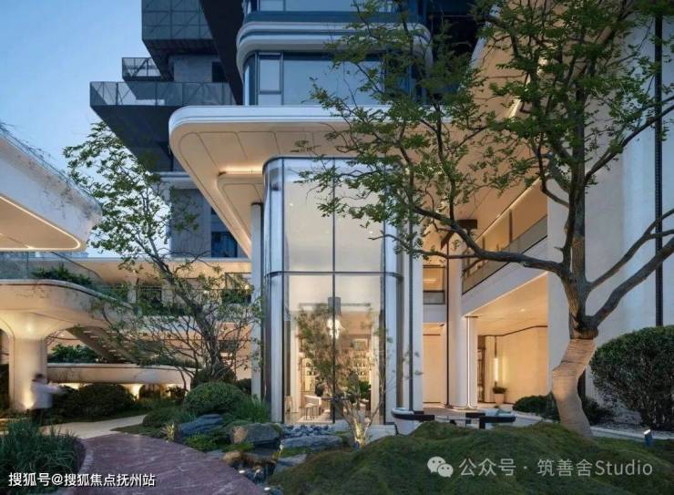 更值得注意的是其“抬板社区”的设计逻辑。通过将地库整体抬高约3.5米,住宅首层架空4.5-6米,项目不仅优化了传统地下空间的采光通风,更释放了完整的地表空间用于景观营造。约2200㎡的垂直浮岛会所镶嵌其中,包含恒温泳池、书吧、健身区等,形成了“架空+下沉+挑高”的立体景观体系。
