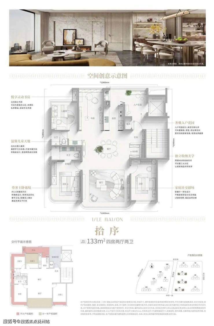 建面约133㎡户型:入户花园增添户型动线,800库设计增加收纳空间,书房与儿童房可根据家庭生命周期进行调整,既可打通形成宽敞的亲子互动区,也可分隔为独立的学习或休息空间。