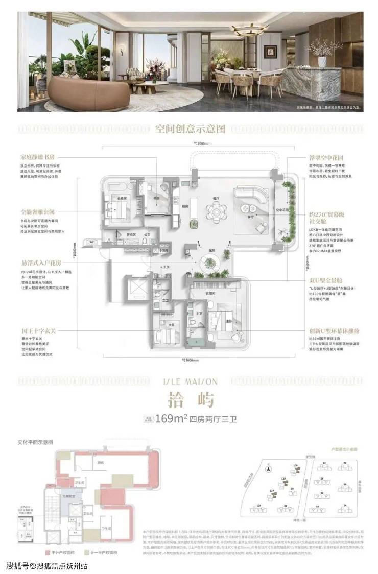建面约142㎡户型:客厅面宽拓展至约6米,实现双卧甚至三卧的独立套房格局。建面约169㎡户型:引入“双U全景舱”设计,结合南北双阳台和空中花园,形成了“南厅北院”的格局,得房率约117%,居住舒适度显著提高。