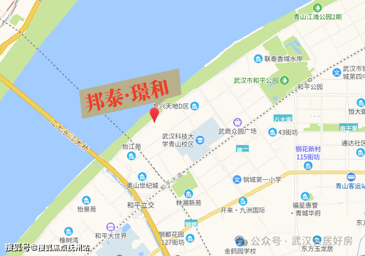 邦泰·璟和坐落于武汉青山区临江大道与三弓路交汇处,是青山滨江板块中兼具景观稀缺性与交通效率的关键地块。项目直面长江,拥有连续、开阔的一线无遮挡江景界面,这使其显著区别于传统城区内部楼盘。同时临江大道的城市主干道属性,也为项目带来了快速通达的交通优势,实现了“观江”与“出勤”的双重价值。