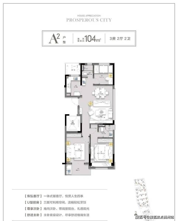 建面约104㎡是三房两厅两卫户型,为边套。