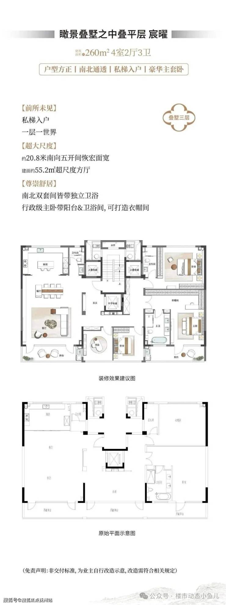 平层约260㎡,私梯入户,一层一世界。约20.8米南向五开间恢宏面宽,约55.2㎡超尺度方厅,南北双套间皆带独立卫浴,行政级主卧带阳台&卫浴间&独立衣帽间。