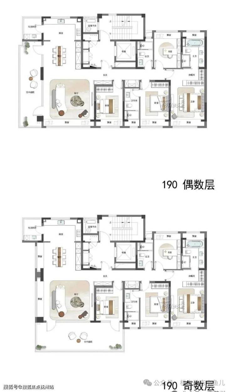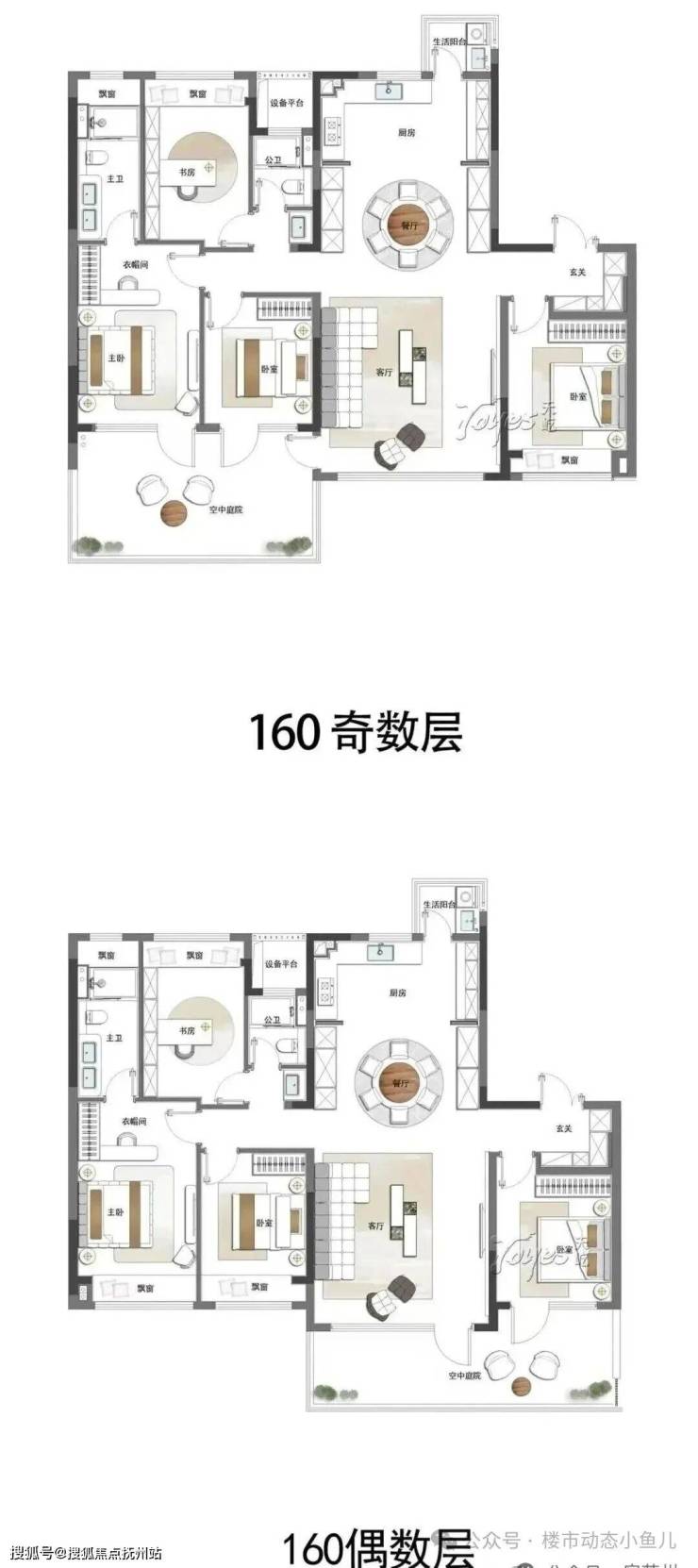 南向三卧,其中主卧带衣帽间与双台盆卫浴,朝南还带一个建面约22.75㎡空中庭院。建面约160m²洋房