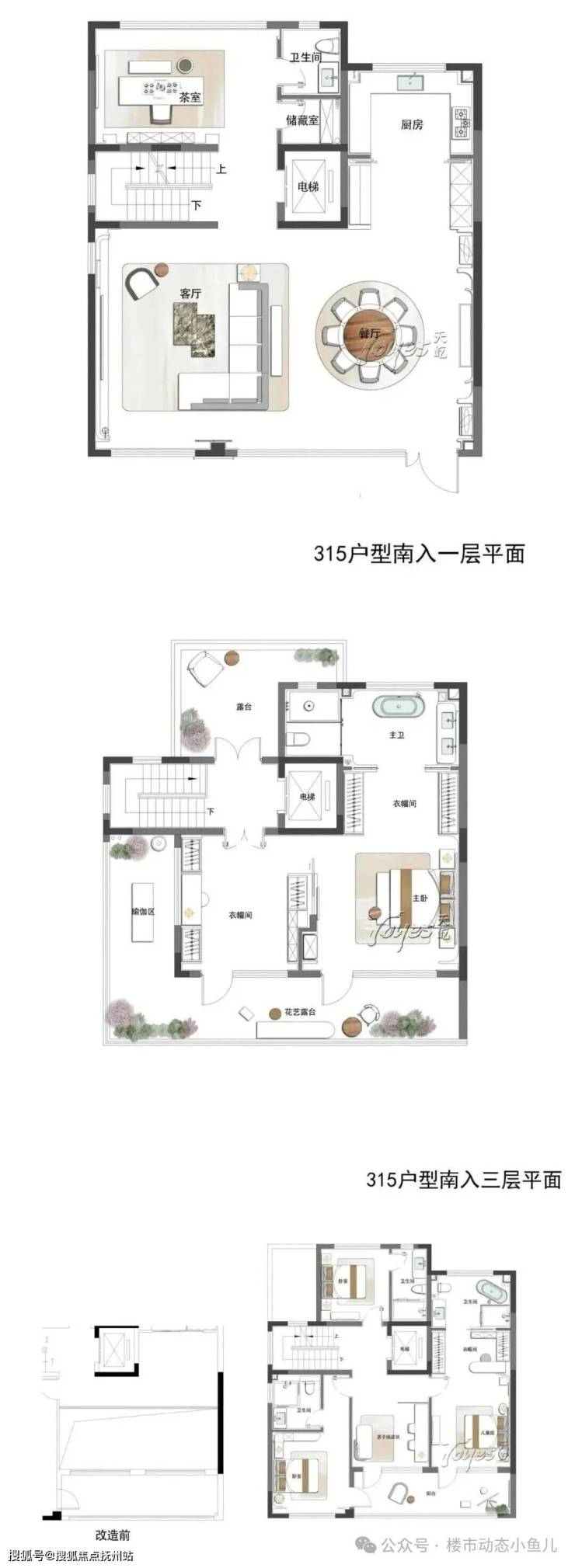 约315㎡户型的特点就是彻底动静分区,一楼超大公区+茶室,二楼经改造,在三套房之外还带亲子阅读间,也可以做家庭客厅,三楼是整层主卧套房,带南北双露台。