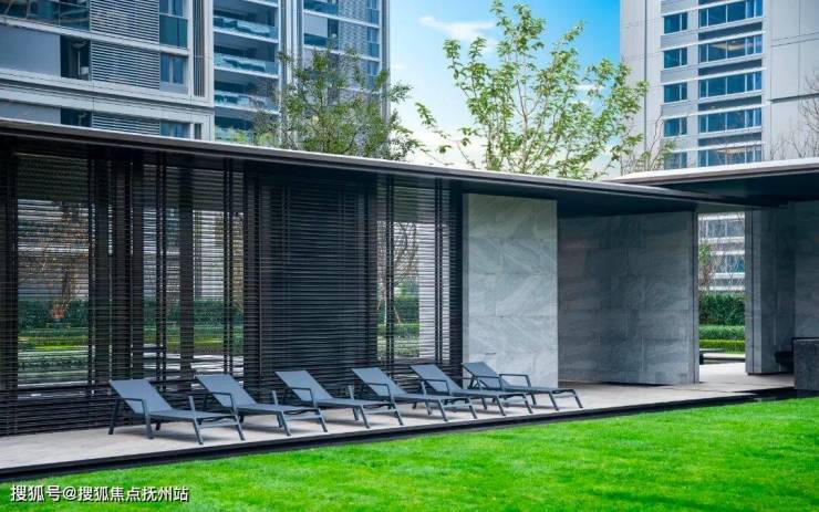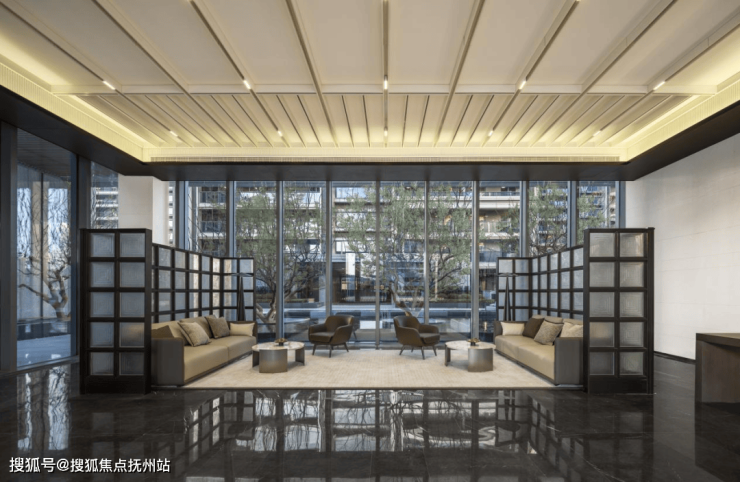 搭配星级酒店洄游式落客区的社区门头,带来奢阔大气的归家礼序。再加上度假式中庭水景,让每一次归家,都优雅且从容。伴着潺潺的水声,漫步归家,行至极具东方韵味的社区大堂,或在此会客、或在此小憩。社区大堂运用了大量玻璃立面,完美地将室外的风景尽数收揽其中,再加上极具东方美学的屏风及高级真皮座椅,整体空间给每一位归家者带来舒适亦优雅的感受。