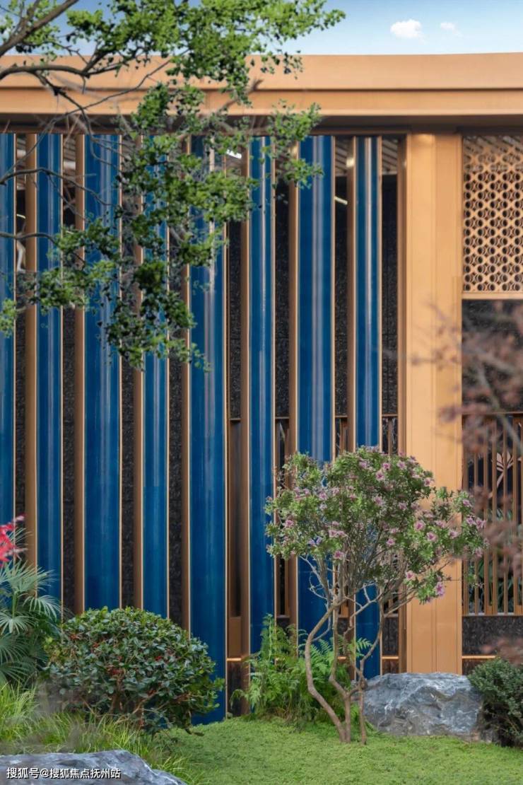 景泰蓝质感弧形造型陶板,作为空间过渡的屏风,由设计师亲至故宫,以故宫珍藏明代宣德年间的景泰蓝为色板,再现人文珍赏。半浮空中的金属镂空亭,内外之间彷若披上一层轻盈的面纱,颇有一番朦胧意境。