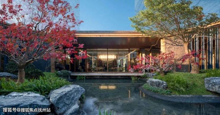 二进院以王羲之《兰亭序》为创作母题,将中式的写意山水,转化成现代东方审美的设计表达,打造月雾雅集、清泉照月、群贤叙月、抚林颂月四大主题景观。