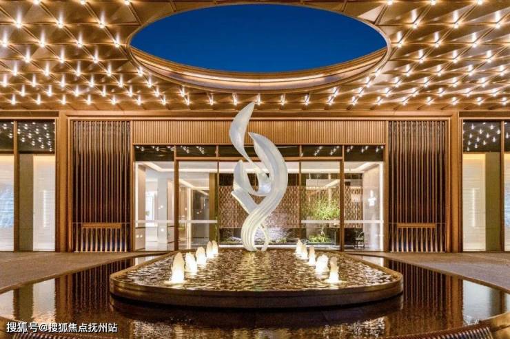 主入口的星空顶,则以香槟金铝板及不锈钢勾勒轻奢质感,满月为设计原型的镂空圆顶下,是汲取余姚市树广玉兰为灵感的玉兰雕塑,呼应“月下浑无色”的皎洁之境。