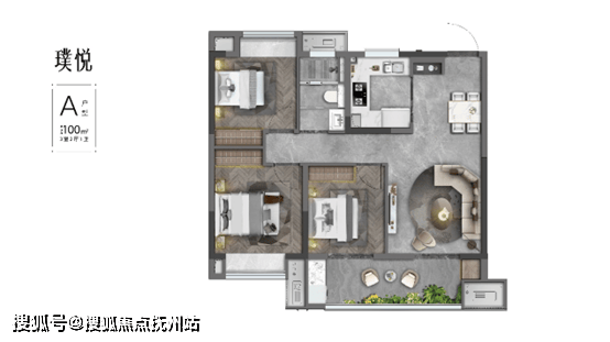 建面约100㎡,3室2厅1卫,户型方正,实用型空间设计;配有约6.3m观景双阳台,小户型中难得一见的大横厅设计。