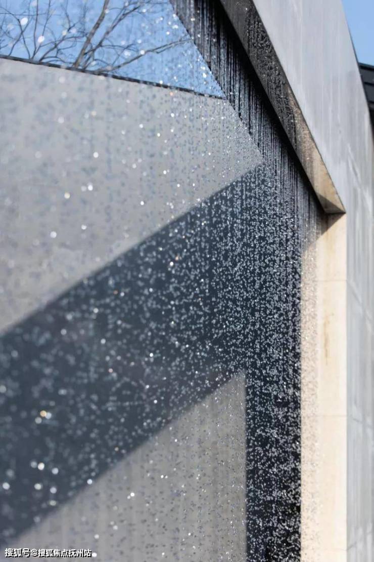 镜面水景倒映着建筑的倩影,水面与建筑融为一体。人们踱步经过,从水景侧边的镜面不锈钢中,不断看见自己的身影,趣味十足。黑色的池底,仿若一方墨池,呼应绍兴后马八景之一的“趣园墨池”。景观雕塑仿照绍兴柯岩云骨之形,静于水面,正气凛然。