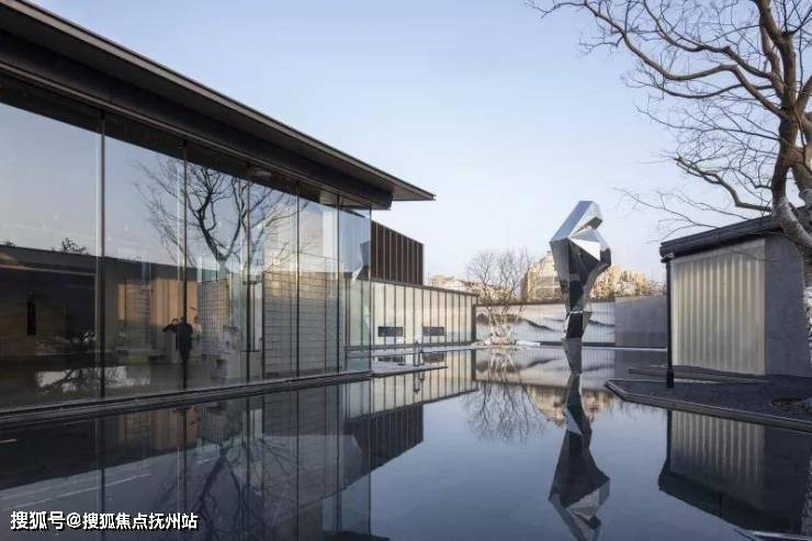 穿过大型玻璃构筑,走进前场。门楼前开阔的广场,昭示了元垄·华著“现代化、城市化”高端楼盘的定位。穿过西周直江上的景桥,即可看见景观水帘,水流淅淅沥沥地流淌,灵动悦耳,与简约的门楼相互映衬。踏上台阶,超大水面映入眼帘,水中倒映着简约现代、充满绍兴特色的销售中心建筑。
