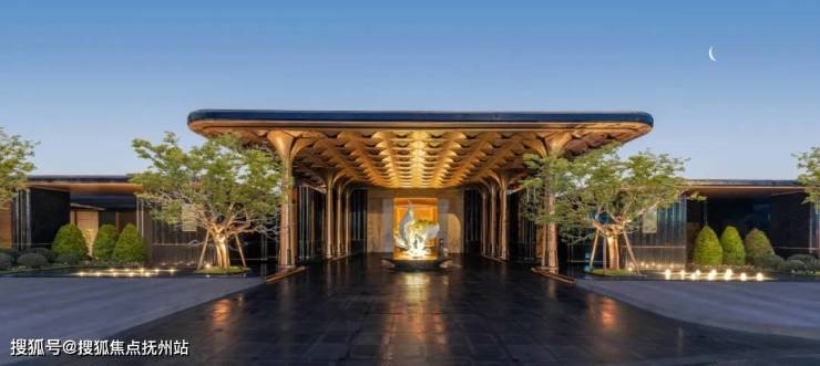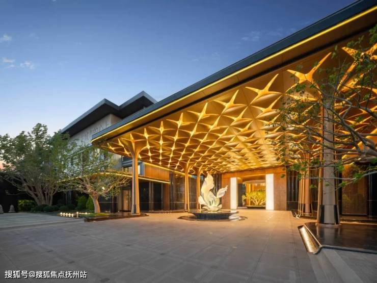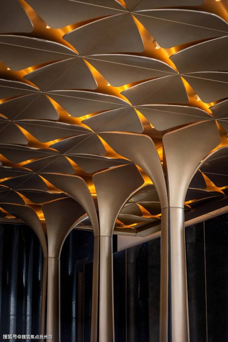 主入口极尽门庭奢礼。全长约42m的超宽门庭,迅速攫住人们的视线。设计提炼百合元素,大尺度雨棚由8根巨型花瓣柱阵列托起,200多片百合花瓣组成的金色吊顶之下百合雕塑熠熠生辉。一扇玉石大门静待开启。