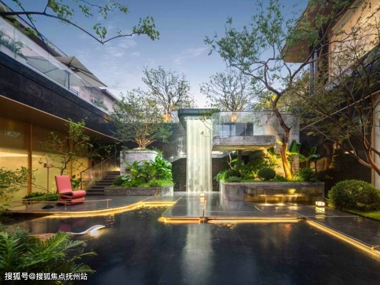 循着“百合”水池尽端,水流倾泻而下,化为一练飞瀑,汇入地下水池;一个完整的下沉庭院豁然展开,别有一番园林景致。凭借足有约5.2米的地势高差,利用地下会所空间围合形成一个垂直的立体花园,360°向室内空间弥漫、渗透,共享视觉盛宴。