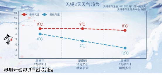据无锡气象发布的寒潮警报,受强冷空气影响,预计24到26日,无锡大部分镇街48小时最低气温将下降8~9℃并伴有陆上4~5级、江河湖面阵风6级的偏北大风,26日早晨最低气温-2℃左右。