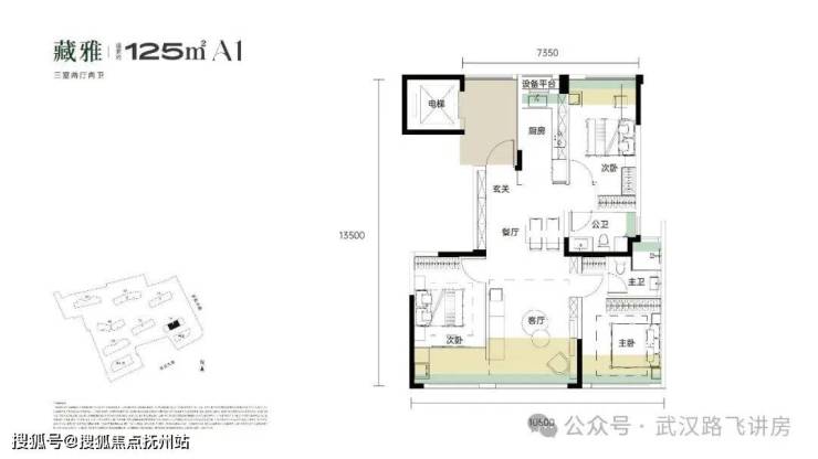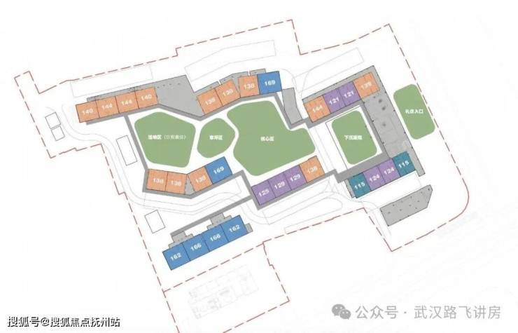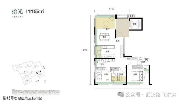 ①115㎡户型:三房两厅两卫,1号楼端头边户,3个卧室朝南,餐客厅一体全景舱设计,客厅为北、西(或东)两面采光,带独立电梯前室。户型的结构是仿照豪宅设计的,但面积却非常小,次卧、厨房、客厅均有阳台优化面积,此外飘窗优化面积也较多,部分空间阳台外部预计是有花池作为全赠送面积。