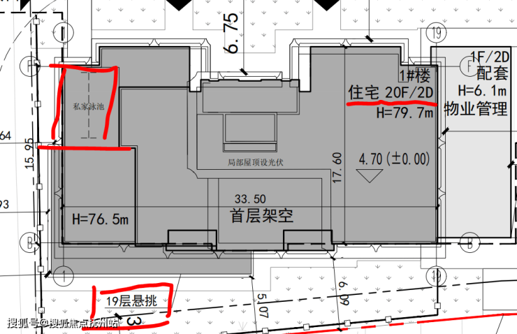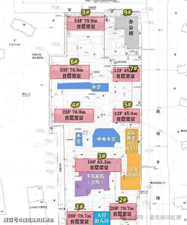该方案亮点颇多,总计八幢高层和小高层设计,最南端的1#和2#楼均设置有私家泳池,而且还在19F采用了住宅楼当中较为少见的悬挑工艺,延伸出了一定的使用空间,个人预估这两幢会是配置大平层豪宅产品。